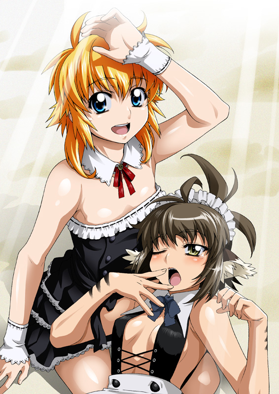 オリキャラより、ファムさんとミアさんを描いてみました。服装はメイド服っぽい水着で背景は砂浜です~。